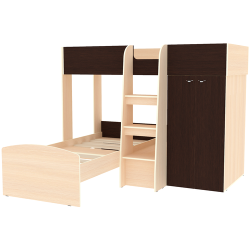 Многофункциональный комплекс для младших школьников и подростков. Особенность модели в компактных размерах, что позволит освободить в комнате больше пространства для игр. Разнообразие цветовых решений позволит подобрать комплекс под любой интерьер. В составе модуля есть удобная кровать-чердак с безопасным бортиком. Внизу располагается рабочее место с компьютерным столом и полкой для книг. Стол оборудован нишей для системного блока и ящиком для канцелярских принадлежностей. В конструкции комплекса продуман вместительный угловой шкаф со штангой и полками. Широкая лестница позволит легко взобраться на второй этаж, а в небольшом ящике в основании лесенки будет удобно хранить различные мелочи. - Габариты: Ш2032 х