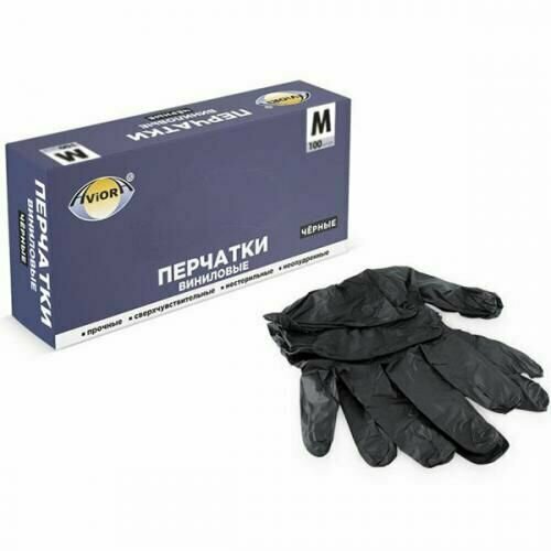 Aviora Перчатки виниловые, неопудренные, одноразовые, черные, размер M, 50 пар