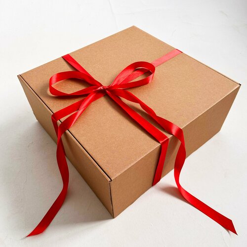 крафт, картонПодарочная коробка 32х32х12см с красной атласной лентой и наполнителем. Картонная коробка с бумажным наполнителем и атласной лентой – отличная упаковка для подарка. В крафтовой коробке презент будет смотреться стильно и лаконично.