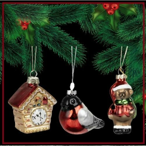 Набор елочных игрушек, 3 шт, "Снежное кружево", домик-часы, снегирь И мишка, по 8-9см, стекло