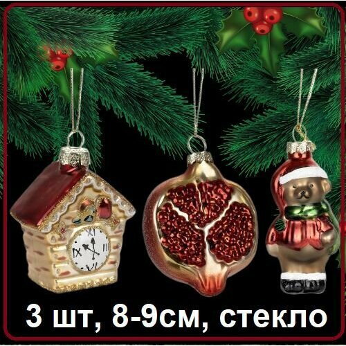Набор елочных игрушек, 3 шт, "Снежное кружево", гранат, домик И мишка, по 8-9см, стекло