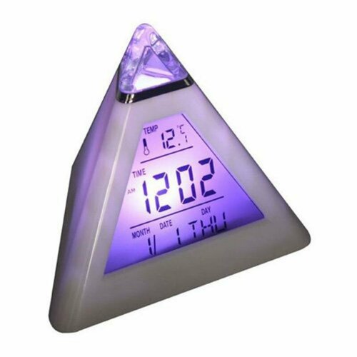Часы настольные электронные от сети, треугольные под дерево, черные, зеленый циферблат