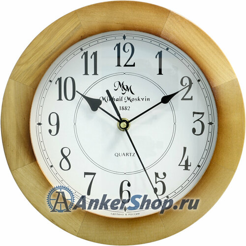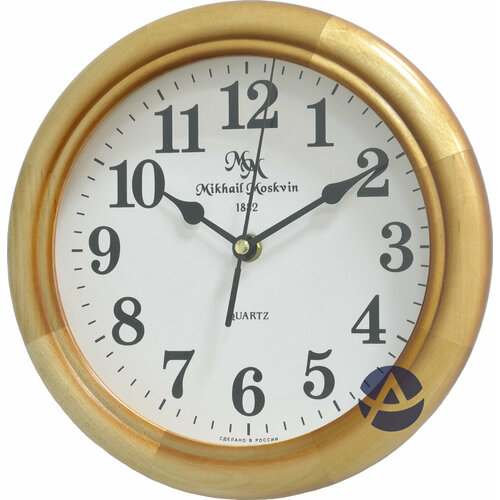 Большие настенные часы MIRRON P2849A НД3Б/Круглые часы с диаметром 35.5 см/Светло-коричневый цвет корпуса/Белый (светлый) циферблат/Большие арабские цифры/Часы в минималистичном дизайне