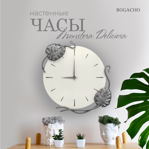 Часы настенные интерьерные BOGACHO Monstera Deliciosa Колор белого цвета с декоративными коваными элементами серебристого цвета