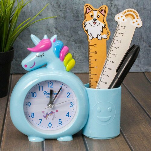 Часы-будильник с подставкой для канцелярии Радужный единорог, голубой