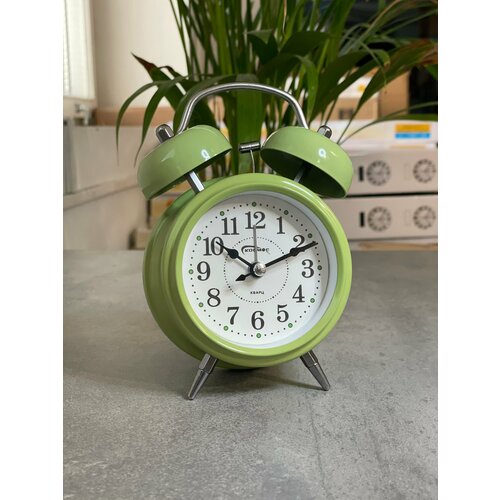 Часы настольные будильник кварцевый, тихий, круглые, стрелки светятся
