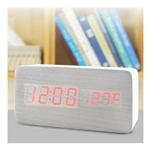 Часы-будильник "Прямоугольник" 15см с термометром белое дерево красные цифры зв. активация
