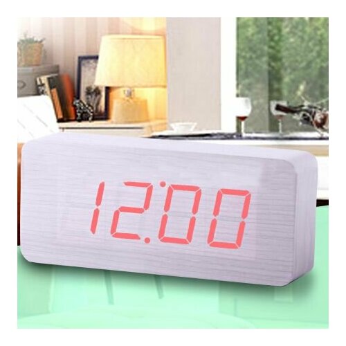 Часы-будильник "Прямоугольник" большой 21 см деревянные цвет: белое дерево красные цифры зв. активация