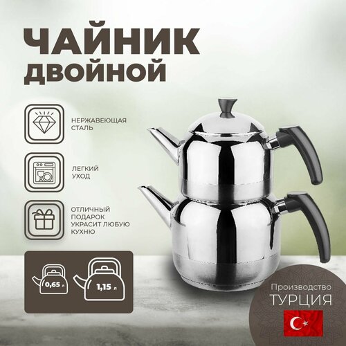 Набор из 2 чайников из нержавеющей стали. Чайник двойной турецкий . Чайник для газовой плиты . O. M. S. Набор восточных чайников 1,15 и 0,65 литра.