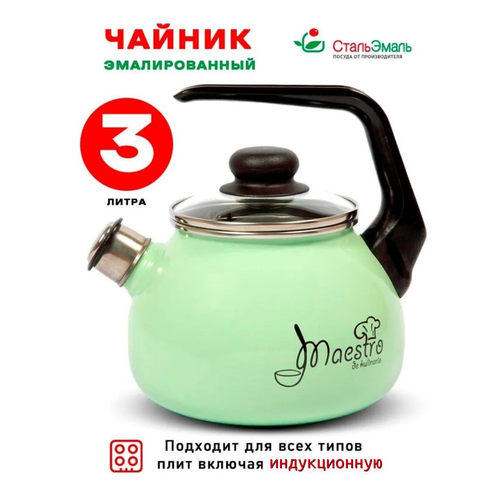 СтальЭмаль Чайник Maestro со свистком 1RC12, 3 л, 3 л, чёрный с зерном / салатный