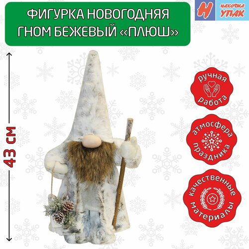 Фигура новогодняя "НаходкаУпак" Санта Гном "Плюшик" с санями Бежевый 43 см