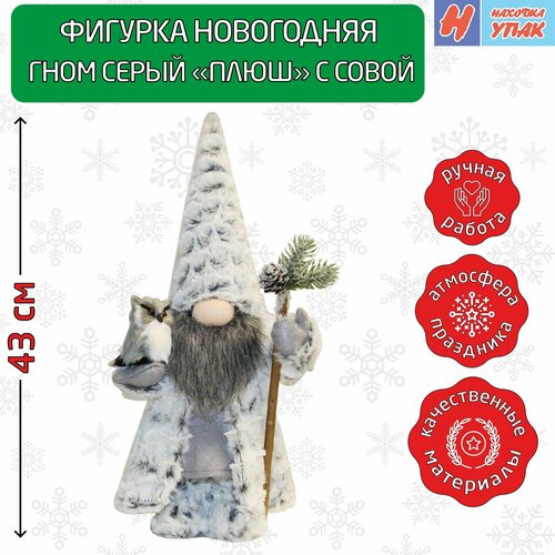 Фигура новогодняя "НаходкаУпак" Санта Гном "Плюшик" с совой Серый 43 см
