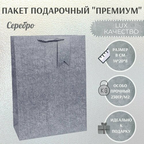 Особопрочный подарочный пакет с ручками 14х20х8 см. "Премиум - Серебро"