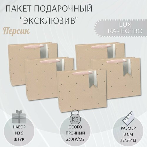 Набор бумажных подарочных пакетов с ручками 32х26х13 см. "Эксклюзив - Персик" 5 шт.