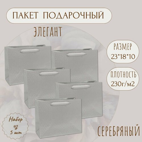 Набор подарочных бумажных пакетов 23х18х10 "Элегант - Серебристый". Плотность 230г./м2. (5 шт.)