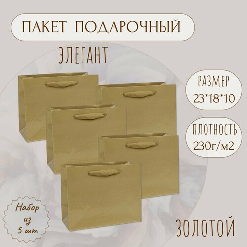 Набор подарочных бумажных пакетов 23х18х10 "Элегант - Золотой". Плотность 230г./м2. (5 шт.)