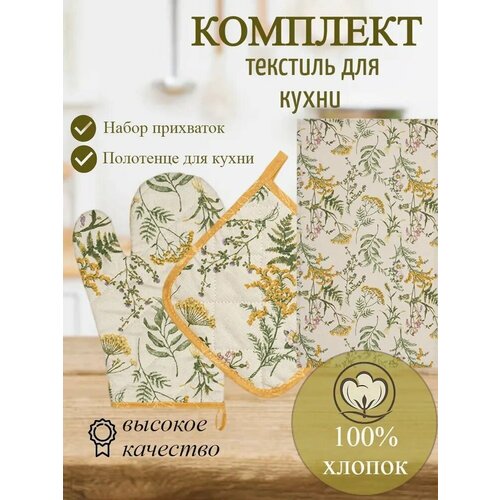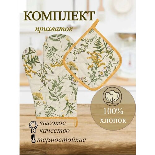 Набор декоративных прихваток для кухни, квадратная прихватка размер (20*20), рукавичка (30*17), текстиль для дома, 100% хлопок. Хербал.