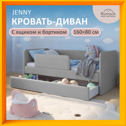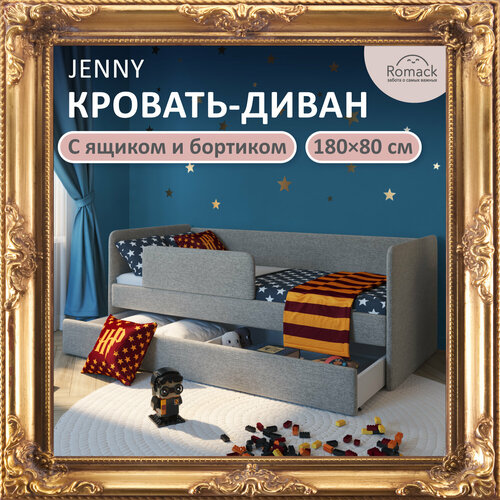 Кровать детская 180х80 Romack Jenny с бортиком и ящиком, с мягким изголовьем, Серая рогожка
