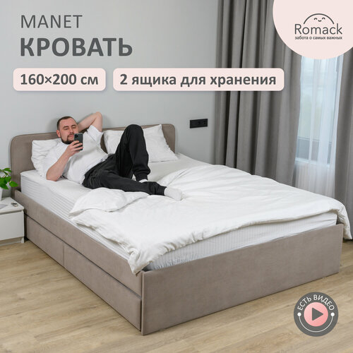 Кровать 160х200 двуспальная Romack Manet микровелюр Мокко, с ящиками выдвижными для белья, с ортопедическим основанием