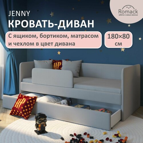 Кровать детская 180х80 см Jenny Серый пух, с матрасом, ортопедическим основанием, защитным бортиком, чехлом на матрас и ящиками для белья.