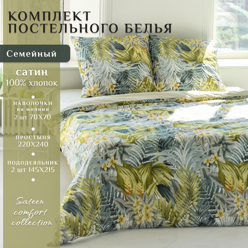 Постельное белье семейное с 2 пододеяльниками 160x220 Simple Living Hawaii комплект сатин, 2 наволочки 50х70, Зеленый