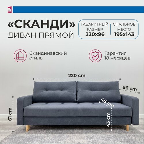 Прямой раскладной “Графитовый” диван кровать еврокнижка Сканди со спальным местом на высоких ножках, с подушками, с независимыми пружинами, с коробом