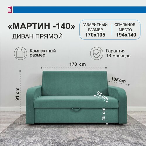 Раскладной двуспальный “Бирюзовый” диван кровать с ящиком, прямой трансформер диван “Аккордеон” Мартин-140, 170х105х91 см
