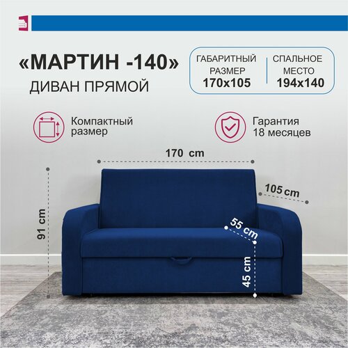 Раскладной двуспальный “Синий” диван кровать с ящиком, прямой трансформер диван “Аккордеон” Мартин-140, 170х105х91 см
