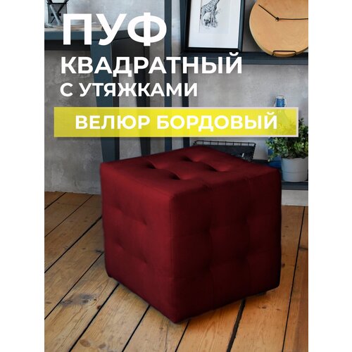 Пуфик куб с утяжками для комнаты прихожей спальни велюр бордовый Grand Family