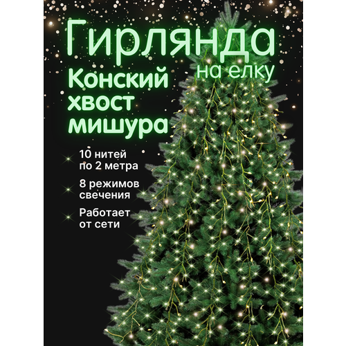 Гирлянда Мишура Конский Хвост на елку 10 нитей по 2 м, IP20, зеленая нить, 200 LED, свечение тёплое белое