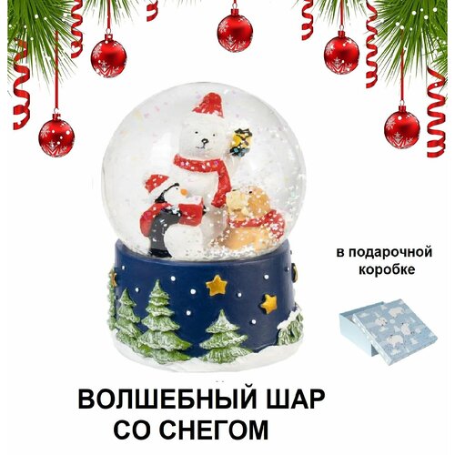 Сувенир Белый мишка с пингвином "Волшебный шар со снегом" в подарочной коробке, Украшение новогоднее, Снежное кружево, 10см* 8см.