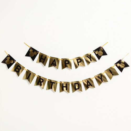 Гирлянда на ленте "Happy Birthday" черно- золотая, 210 см, Микки Маус и его друзья