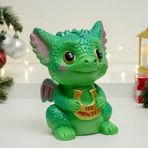 Копилка "Дракон с подковой - на мечту" зеленая с изумрудным, 20см