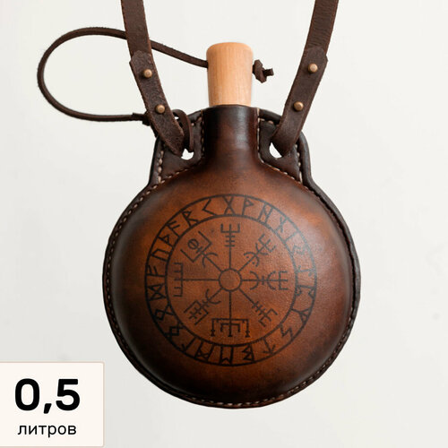 Кожаная фляга Круглая 500 мл с рисунком Вегвизир - компас викингов