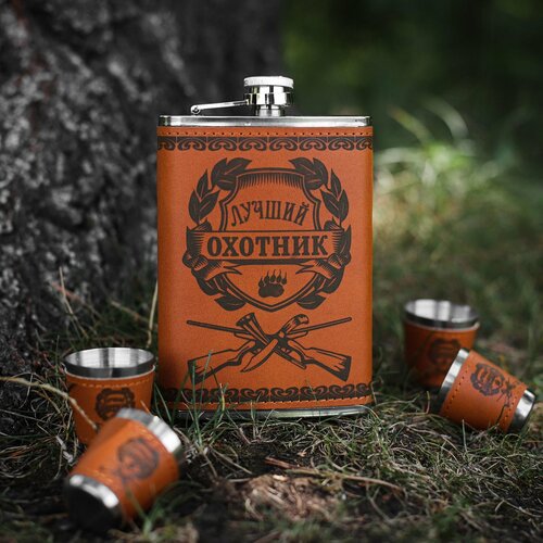 Подарочный набор "Лучший охотник", рыже-коричневый эко-кожзам, фляжка 270 мл, 4 стопки, воронка
