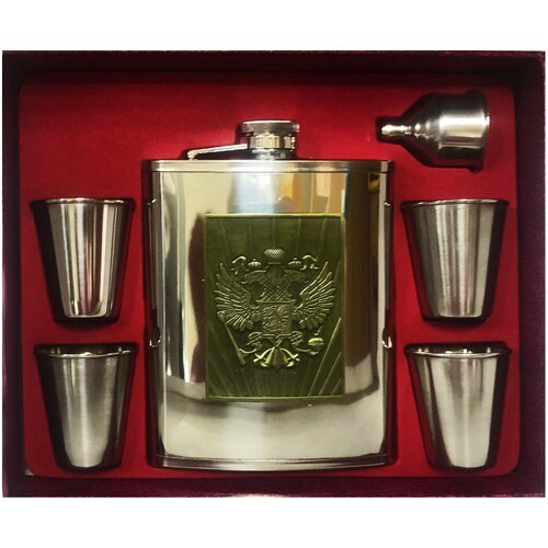 Подарочный набор Герб России, зеркальная фляжка 500 мл., 4 стопки, воронка
