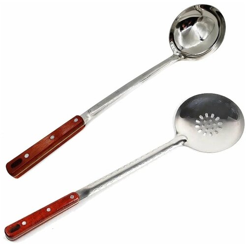 Шумовка и половник для казана, комплект 2 шт / Ложка усиленная для плова с деревянной ручкой