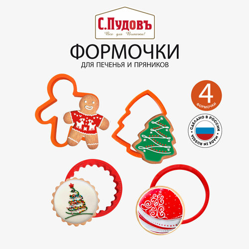 Набор формочек для печенья (Имбирный человечик, Ёлочка, Круг с волн. кр, Круг) С. Пудовъ, 4 шт