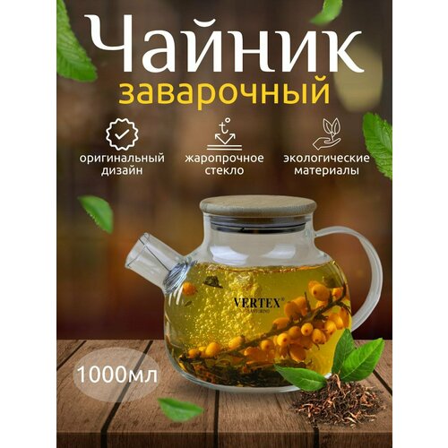 Чайник заварочный стеклянный с крышкой из бамбука, 1000мл