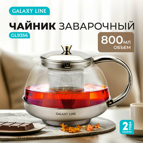 Заварочный чайник GALAXY с ситечком, нержавеющая сталь + стекло, объем 0,8 л