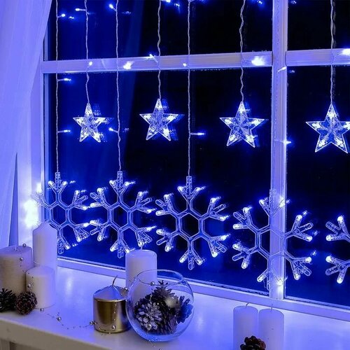 Гирлянда светодиодная Бахрома Снежинки, 12 снежинок, 3*1 метр, с коннектором, синяя