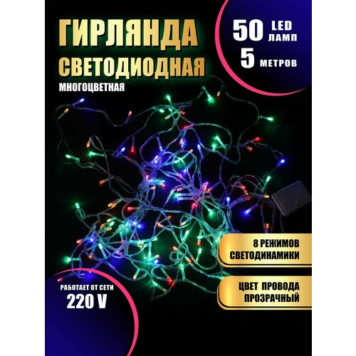 Гирлянда нить новогодняя светодиодная на елку разноцветный 8 режимов работы 5 м 50 диодов от сети 220В
