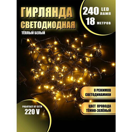 Гирлянда нить новогодняя светодиодная на елку теплый белый 8 режимов работы 18 м 240 диодов от сети 220В