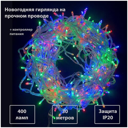 Гирлянда Нить 30 метра, прозрачный провод, цветная 400 ламп, питание 220 Вт