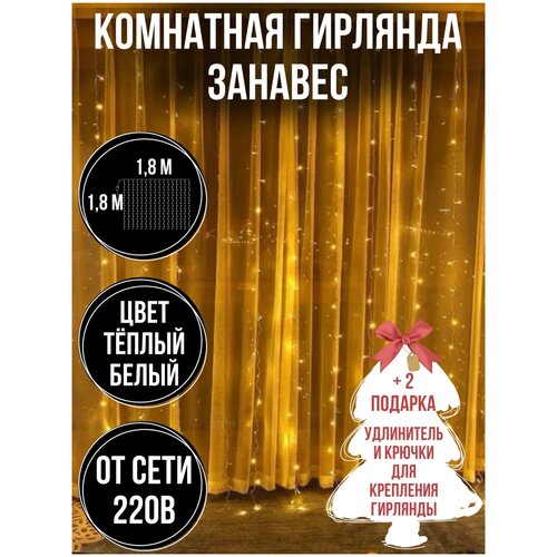 Гирлянда электрическая интерьерная 3х2 метра, Cветодиодная гирлянда штора на Новый год, Занавес, Электрогирлянда, Теплый