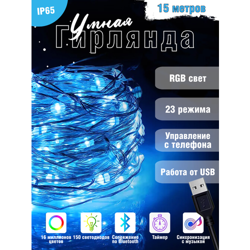 Smart гирлянда, светодиодная RGB с дистанционным управлением через приложение, 150 LED, 15 м