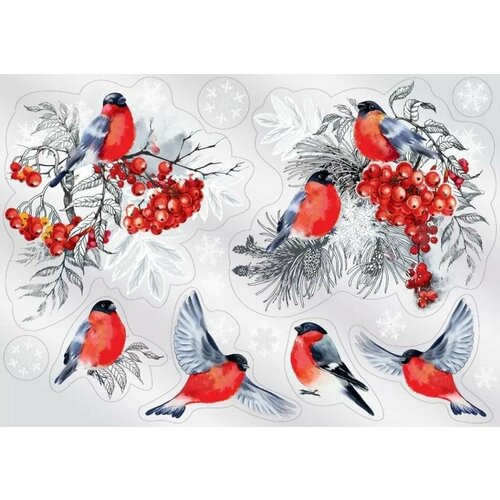 Новогодние наклейки "Снегири и рябина" двусторонние, размер листа 33,2х47 см