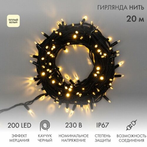 Светодиодная гирлянда Neon-night Нить с эффектом мерцания (все диоды) 20 м, 200 светодиодов, тепло-белое свечение, черный каучук, IP67