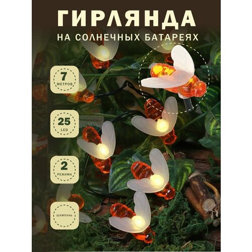 INBLOOM Гирлянда на солн. батарее, 25LED, 7м, шампань, 2 реж, пчелка, ПВХ зел, 2V80mA, 1.2V600mAh