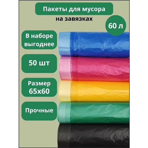 Мешки для сбора мусора 60 литров в рулоне PRO CLEANLY полиэтиленовые мусорные пакеты с ручками завязками для ведра, 50 штук, плотные